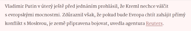 „Vladimir Putin v úterý ešte pred jednaním prehlásil, že Kreml nechce válčit s evropskými mocnostmi. Zdôraznil však, že ak bude Evropa chcieť zahájiť priamy konflikt s Moskvou, je zem pripravená bojovať, uviedla agentura Reuters.“